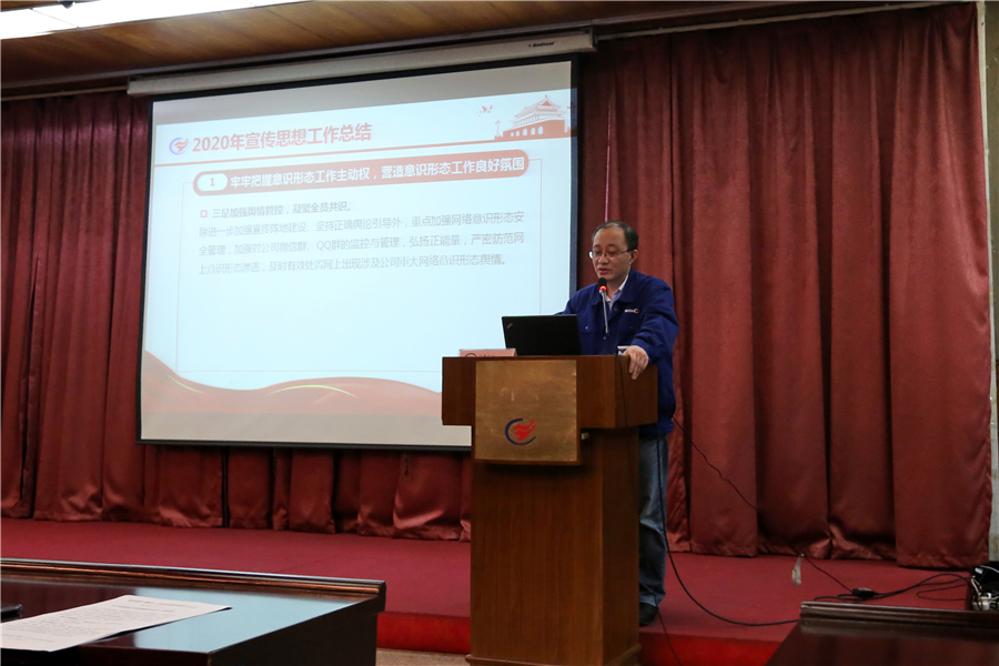 會上,公司黨群工作部部長劉新建作了《2020年宣傳思想工作總結(jié)及2021年宣傳思想工作思路》的工作報告,報告客觀總結(jié)了公司2020年度宣傳思想工作成績,但也指出了宣傳思想工作創(chuàng)新不夠,形式和手段單一,主題不突出;陣地建設(shè)的力度不大,傳播渠道有限;少數(shù)黨支部對宣傳思想工作不重視等問題,并對2021年宣傳思想工作進(jìn)行了部署。報告指出,公司2021年宣傳思想工作四大重點任務(wù)為:一是要正確把握宣傳思想工作的政治性;二是要確保宣傳思想工作的有效性;三是積極探索宣傳思想工作的多樣性;四是發(fā)揮思想引領(lǐng)、輿論推動、精神激勵的重要作用,深入做好意識形態(tài)工作。